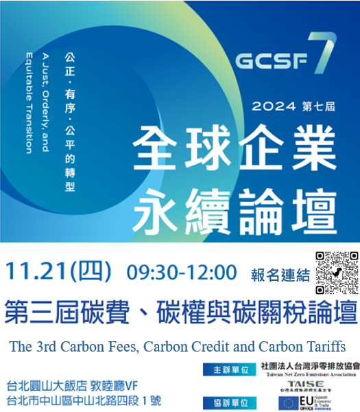 Taiwan Net Zero Emission Association cordially invites you to attend the 3rd Carbon Fee, Carbon Rights and Carbon Tariff Forum of GCSF 2024, which will be held on November 21, 2024 at the Dunkin' Hall VF, Taipei Yuanshan Hotel.