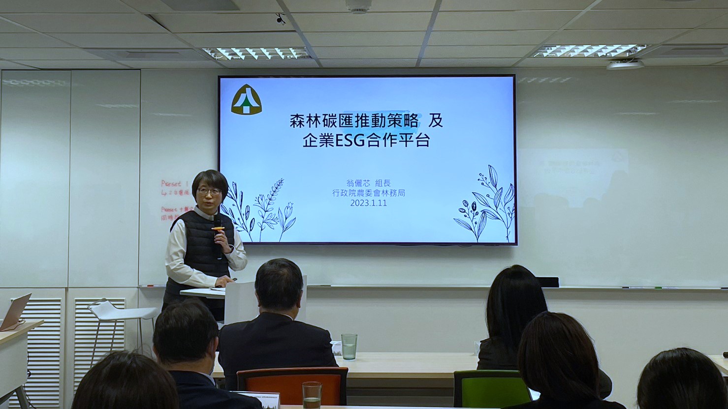 行政院農委會林務局的翁儷芯組長則分享臺灣目前林業現況以及規劃建置中的ESG媒合平台。翁組長表示,台灣森林覆蓋率為60.7%,總面積達219.7萬公頃。這裡面儲存的碳有七億五千萬噸二氧化碳當量 (CO2e),每年可以移除大氣中約兩千一百萬噸二氧化碳當量,相當於我國總碳排放量的7.3%。林務局希望藉由推動一系列專案,包含混農林業與都市林營造計劃等來進一步提升私有土地的森林碳匯。另外竹子因為生長快速,所以有絕佳的碳匯功能。林務局也希望藉由啟用「新興竹產業振興計畫」增加種竹土地以利用竹子的碳匯能力。翁組長最後介紹林務局正規劃建立的一個線上媒合平台以及平台的作業流程,希望在國有林地、私有地主和企業之間搭起對接橋梁,視企業需求量身訂做合作契約取得碳權抵換,並由林務局核發ESG憑證。森林碳匯不只是碳中和的必要手段,更有涵養水源、維護生物多樣性、國土保安等多元生態系服務效益,是實踐ESG最佳途徑。