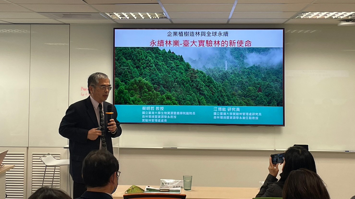 首位講者為臺大實驗林管理處長蔡明哲教授分享永續林業相關內容以及臺大實驗林的新使命。蔡教授首先以今日的主角-森林-的功能來開場,說明森林比較廣為人知的經濟面向(伐林製成木製品)其實只佔25%,有75%都是較易被忽略的生態(生物多樣性)與社會效益(休憩旅遊)面向。無論是哪一種面向,其實都和永續發展息息相關。而企業最在意的是森林可以儲存碳,也就是有碳匯(carbon sink) 的功能。森林碳匯的增加有三種途徑:首先是增加森林面積-通過新植造林來增加儲存的碳量。再來是加強森林經營管理-因為當樹生長趨緩時,碳匯功能會減緩,所以適度的疏伐可以促使樹木生長,反而可以增加儲存量。最後是提高國產材利用-其中收穫林產品 (HWP) 是利用砍伐下來的木材製成各種材料,也由於碳儲存在於這些材料當中,讓木製品成為一種負碳材料。這三種增加森林碳匯的途徑都有可以與企業合作的空間,目前也已經有協助企業設計的方案在執行中。