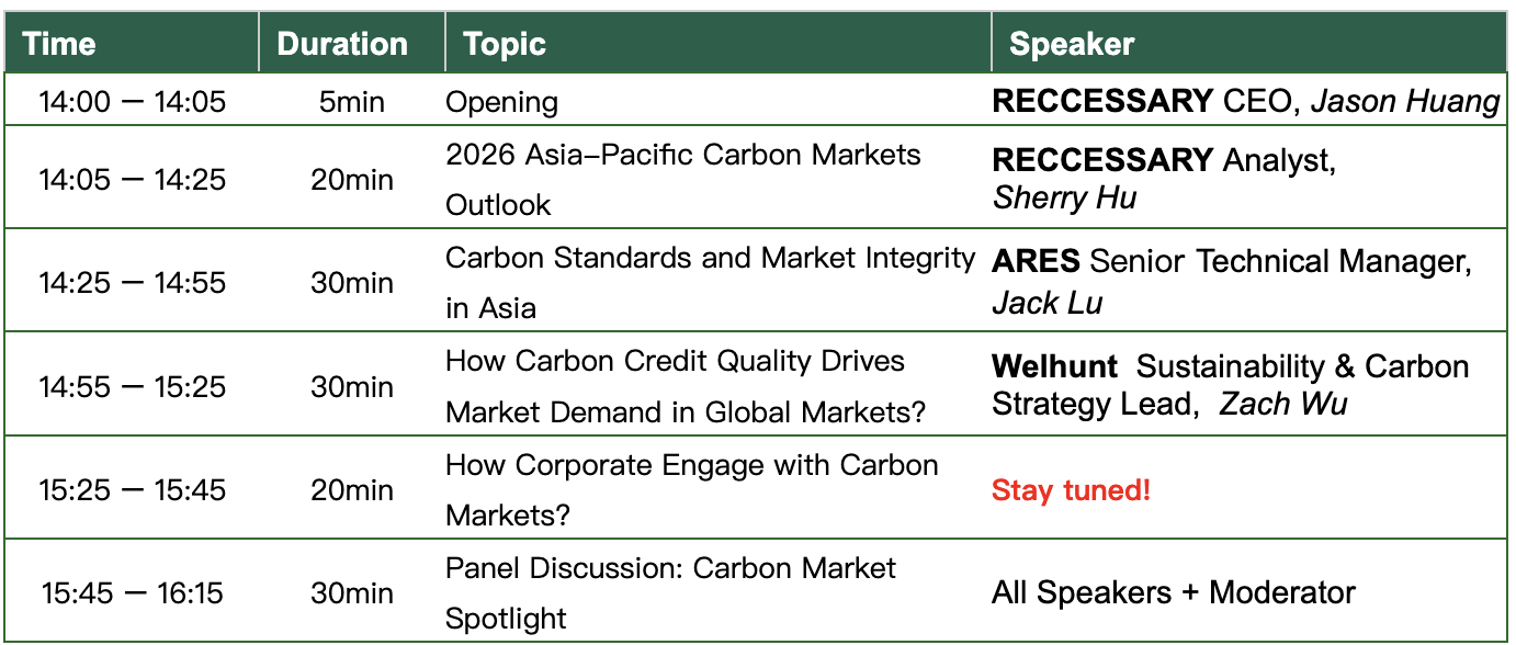 本協會會員 Reccessary,將舉辦年度重量級活動——「2025-2026 亞太碳市場展望」。本次活動將獨家揭露最新的市場調查報告,協助企業在混亂的轉型期中,找到最具成本效益的合規路徑。